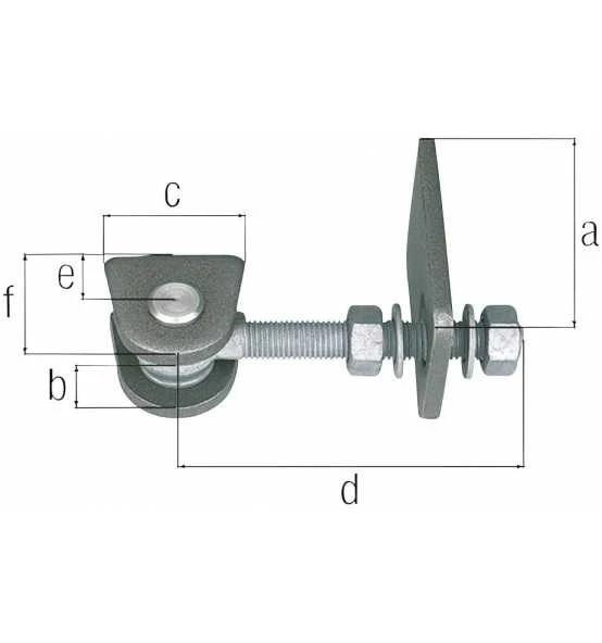 Breite verstellbar, je ein Anschweißstück für Pfosten und Tor, lange Ausführung.